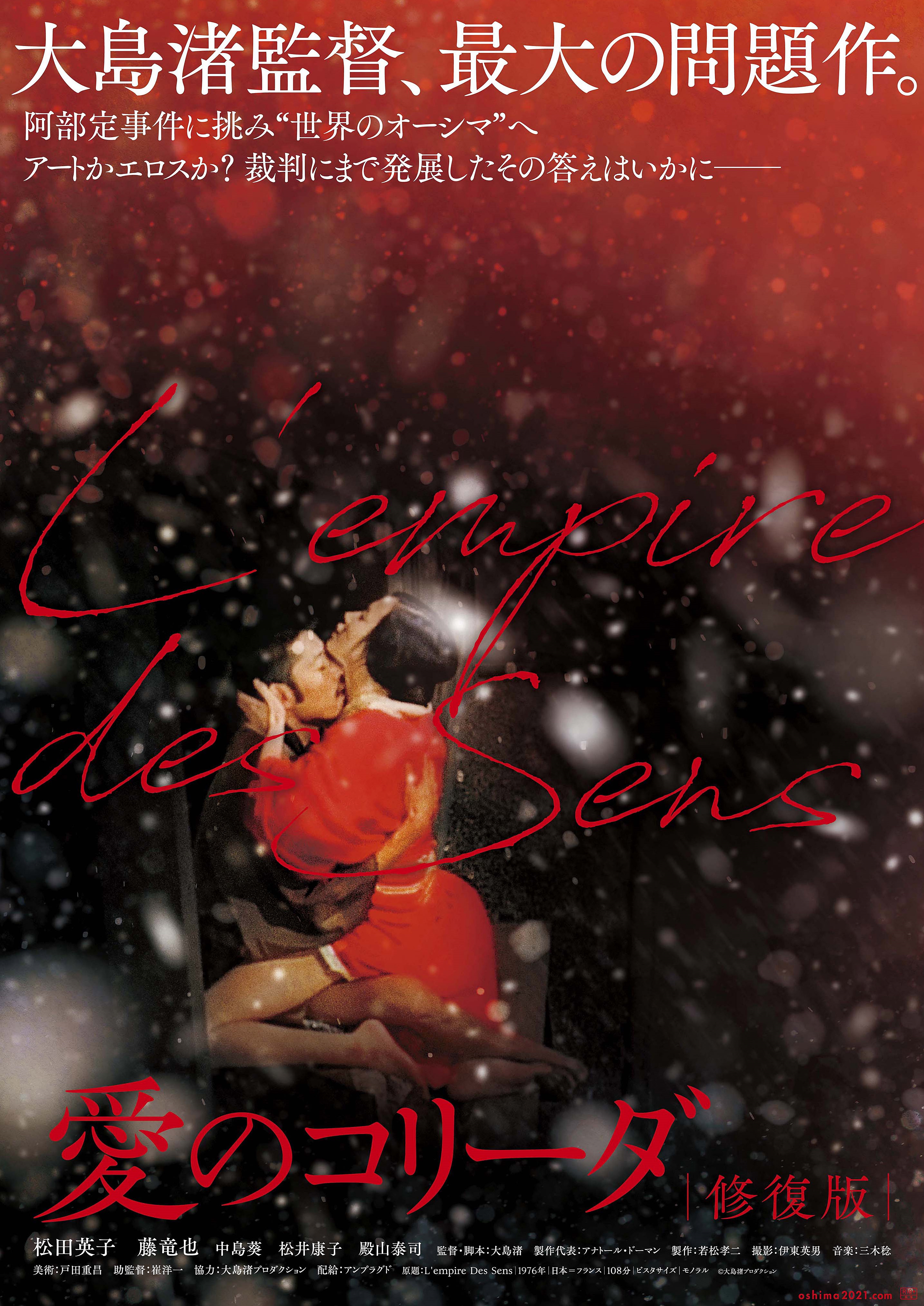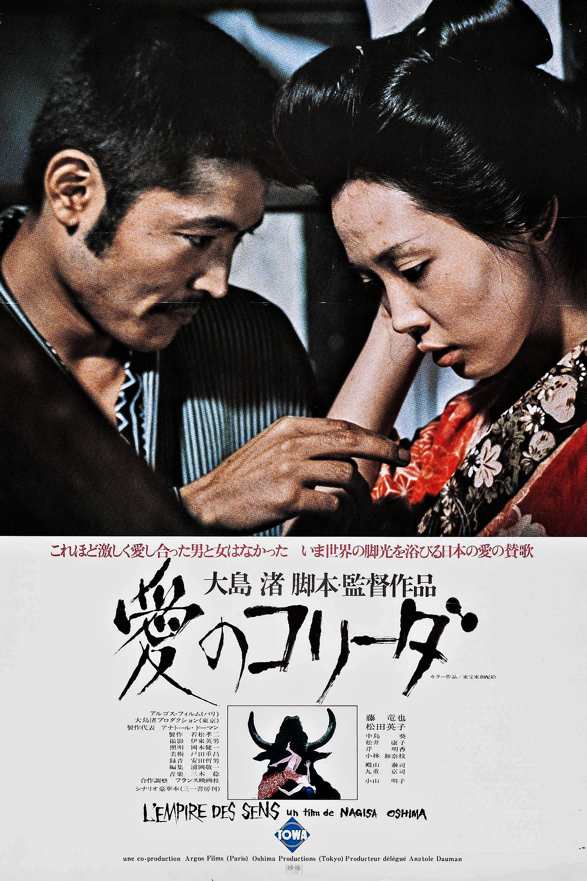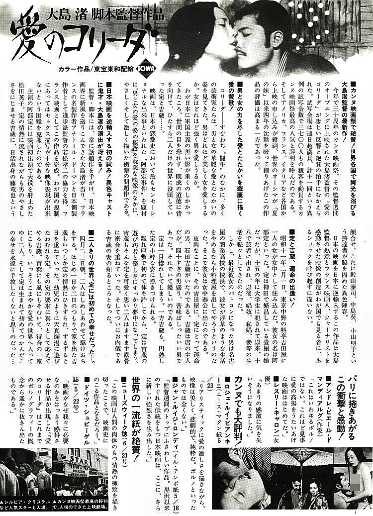 마츠다 에이코(松田暎子)가 '아베사다'를 연기했고, 후지 타츠야(藤 竜也)가 '이시다 키치조' 역을 맡았으며 1976년 제29회 칸 영화제 감독주간에 초청되 전 세계 최초 공개이후 1976년 9월15일 프랑스에서 개봉해 1,730,874명이 관람했으며 일본에서는 같은해 10월15일에 개봉 했습니다.