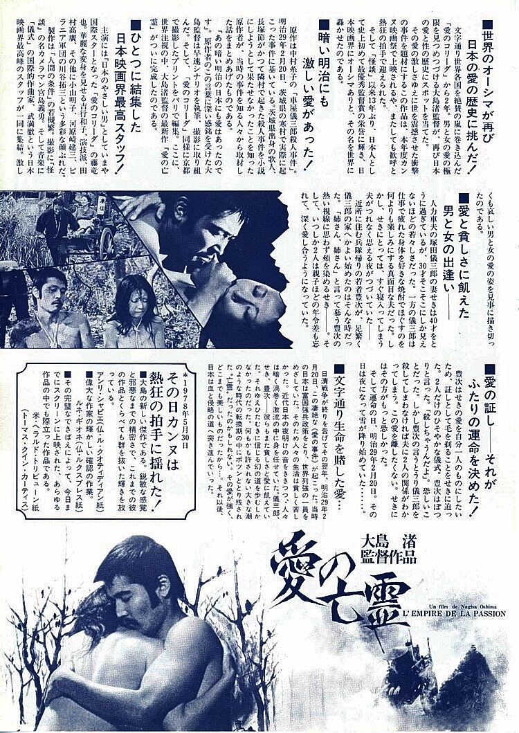 '오시마 나기사' 감독은 거세와 죽음으로 이르는 지독한 사랑의 이야기를 일본 사회에 대한 비판으로 완성했으며, 이 영화 제작으로 기소되는 일까지 벌어지는 등 일본의 도덕적, 성적 금기에 대한 도전적인 영화로 평가받고 있습니다.