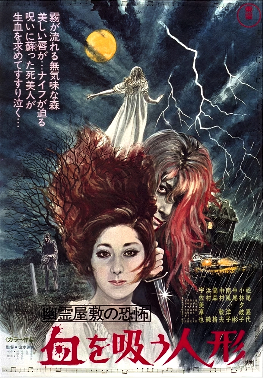 '유령저택의 공포, 피를 빠는 인형(幽霊屋敷の恐怖 血を吸う人形)'은 '야마모토 미치오(山本迪夫)' 감독의 작품으로 1970년 7월4일에 공개된 일본의 특촬 공포물이며 '피를 빠는 시리즈' 3부작 중 첫번째에 해당하는 작품입니다.